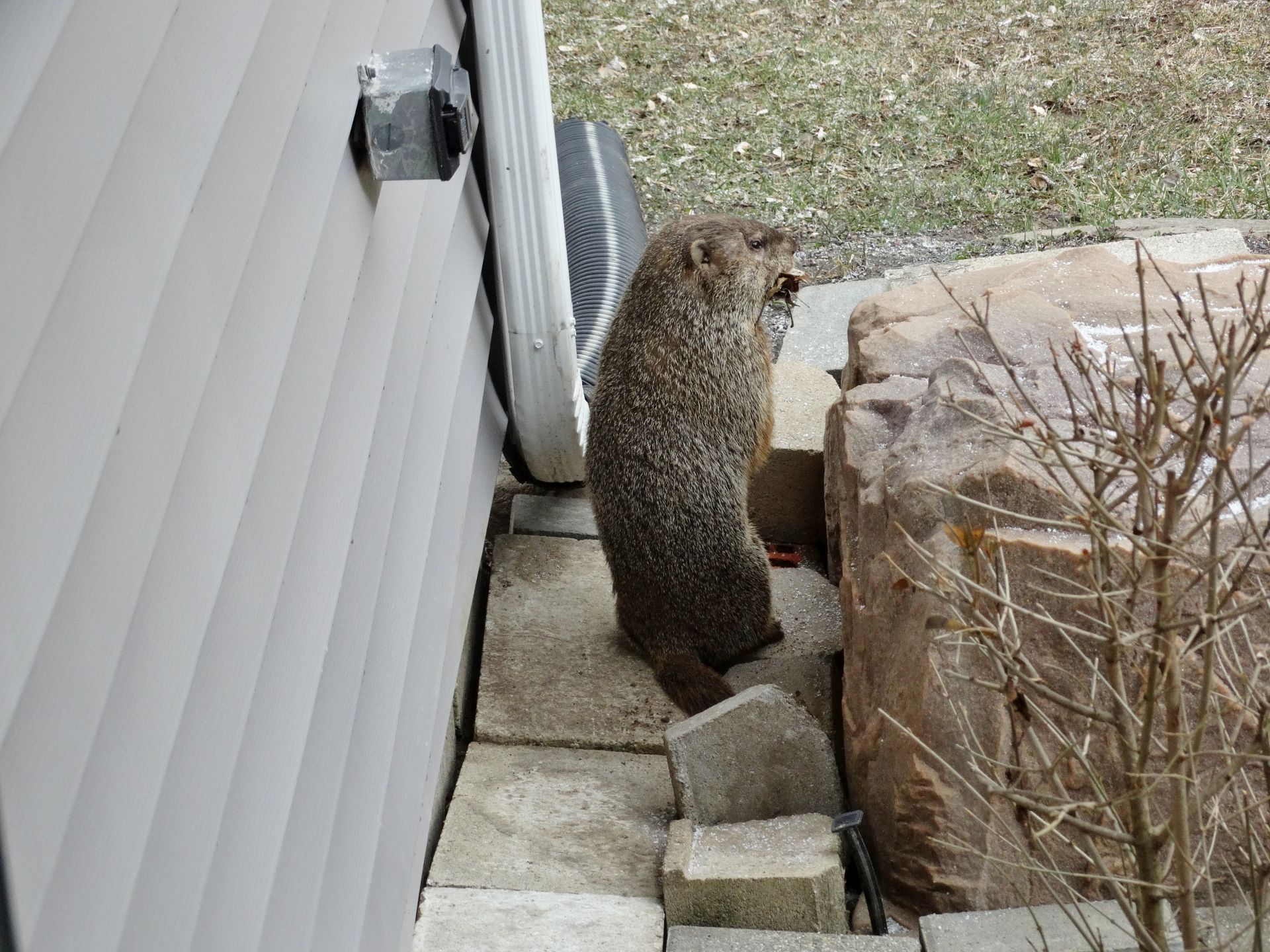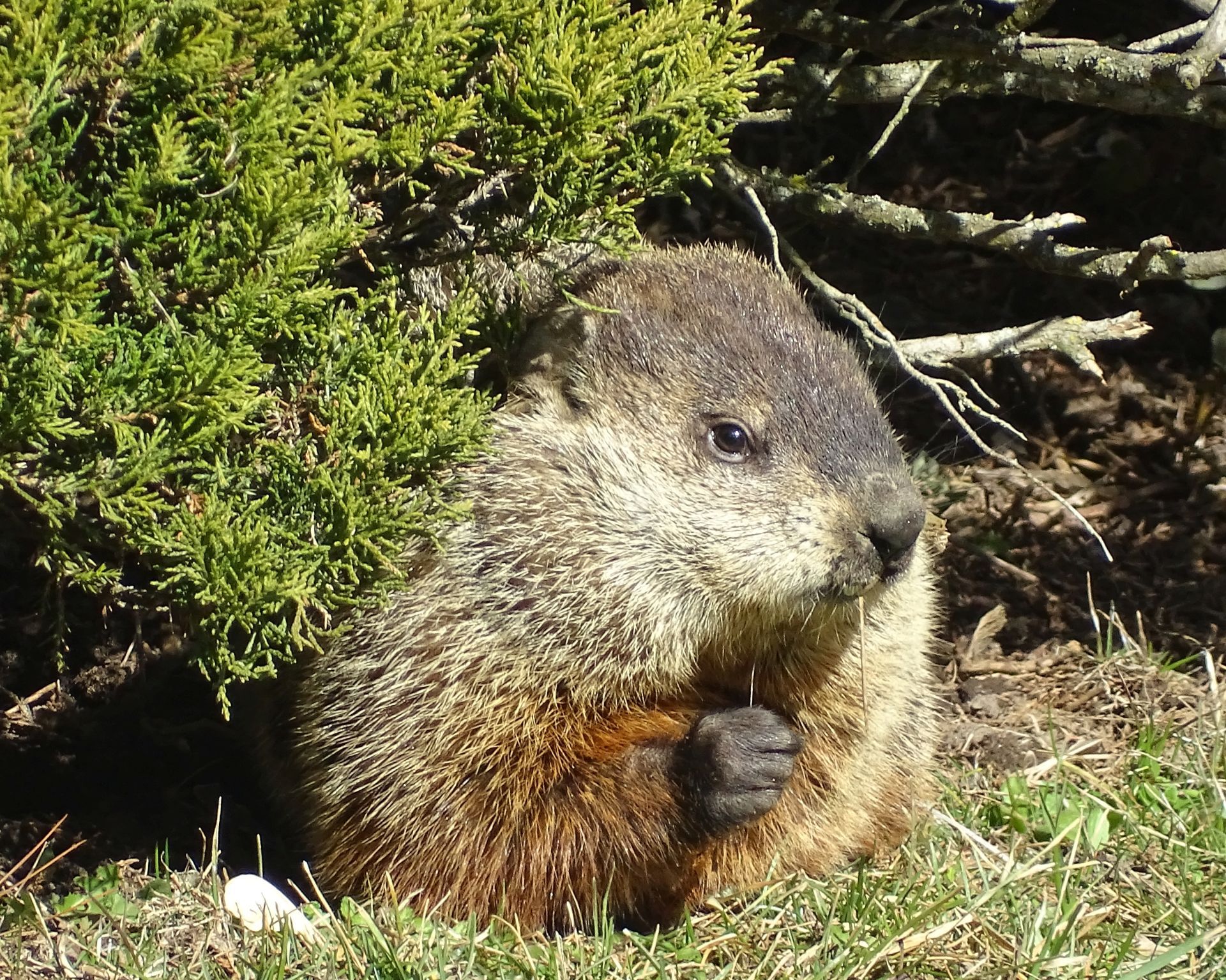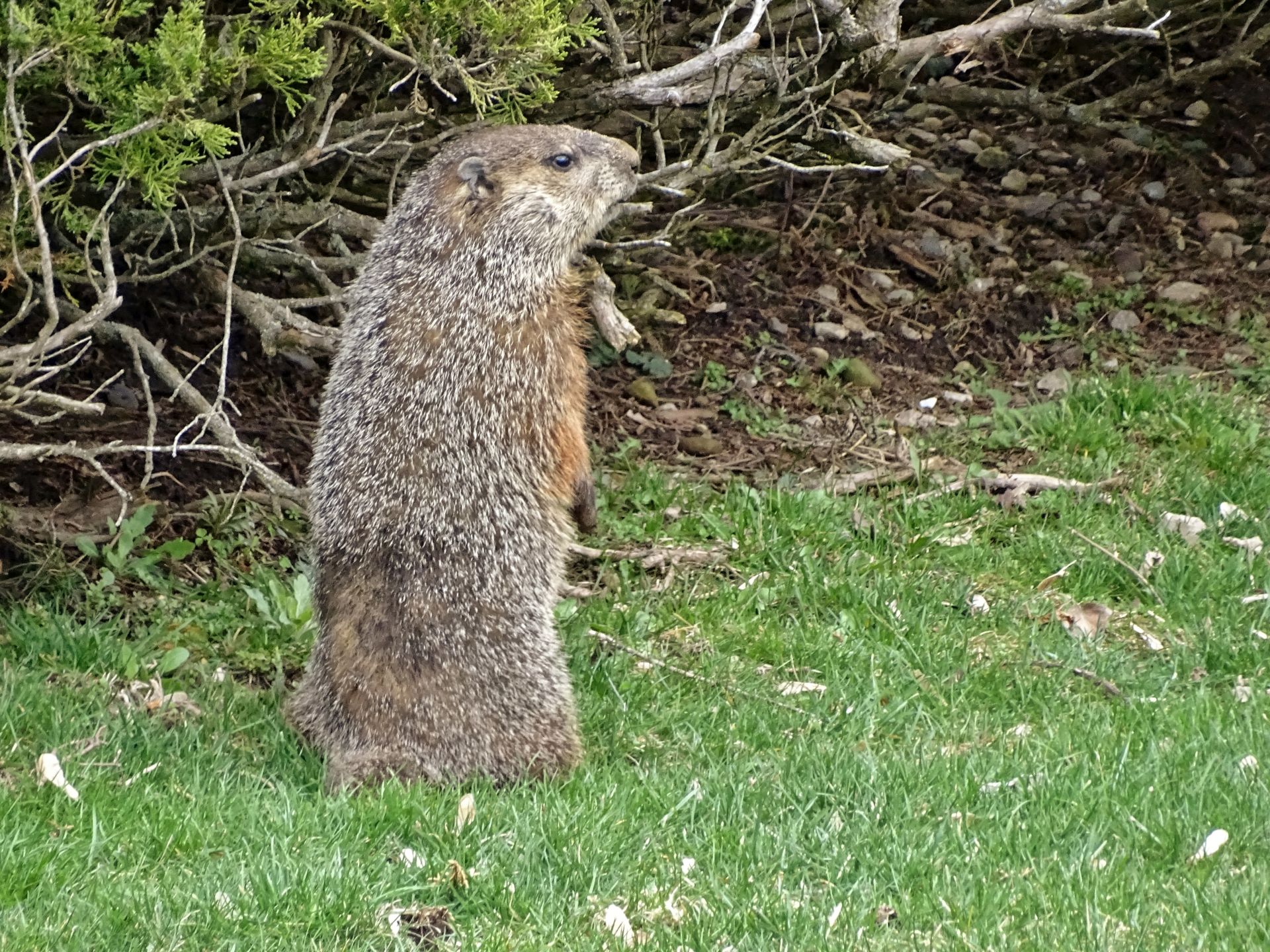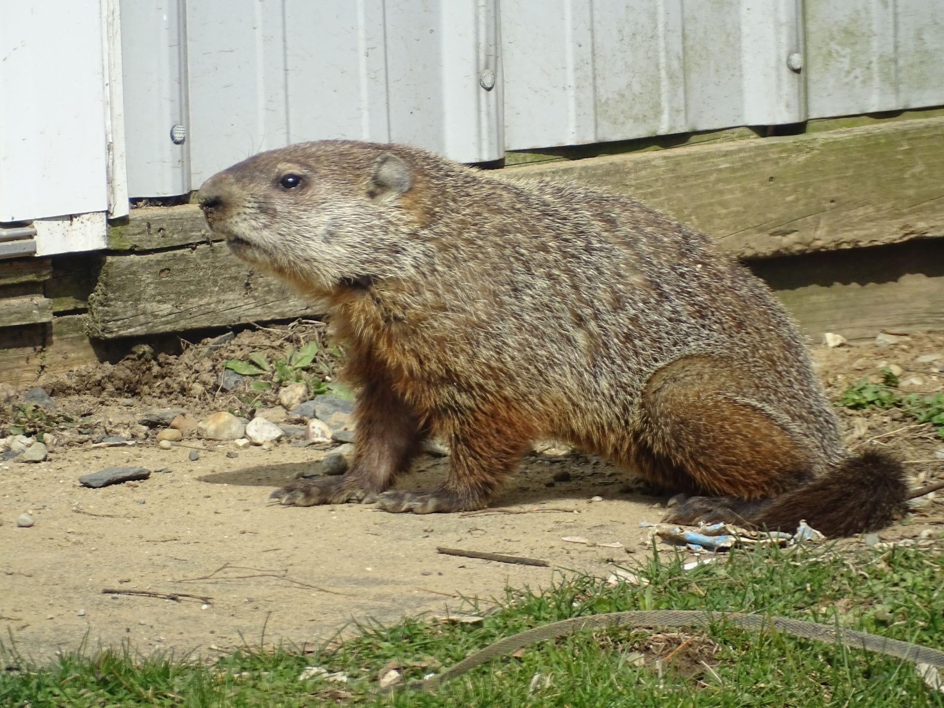Winnie later dug a new burrow near the deck. As she already had another burrow nearby, this opening was filled in. A newer burrow north of our driveway has been observed being used by Milo, Winnie, and Rusty. This location does not create conflict with us, though it does present observation challenges.