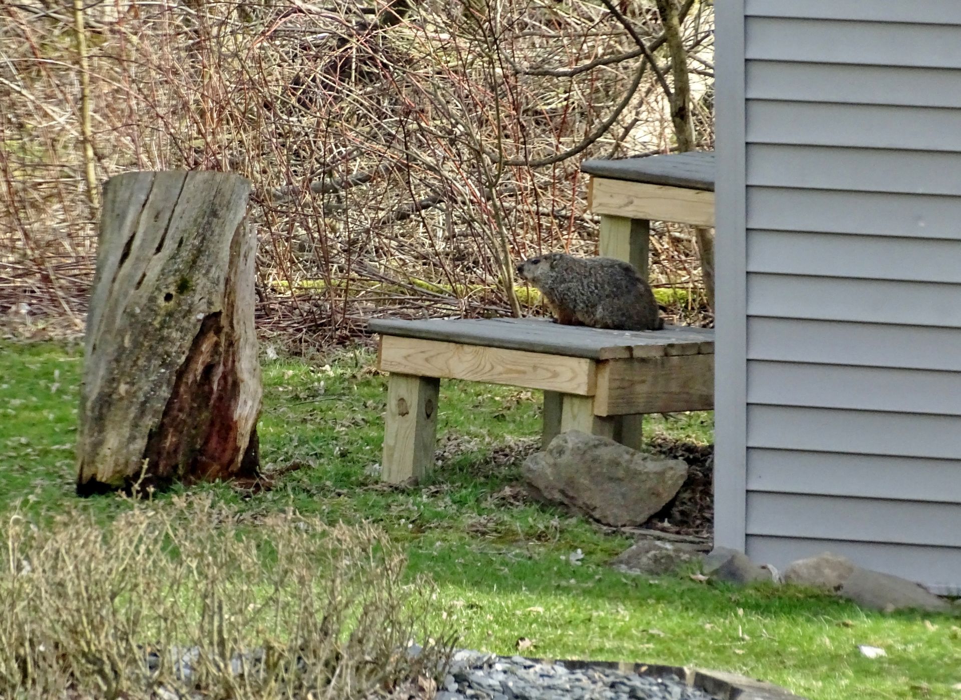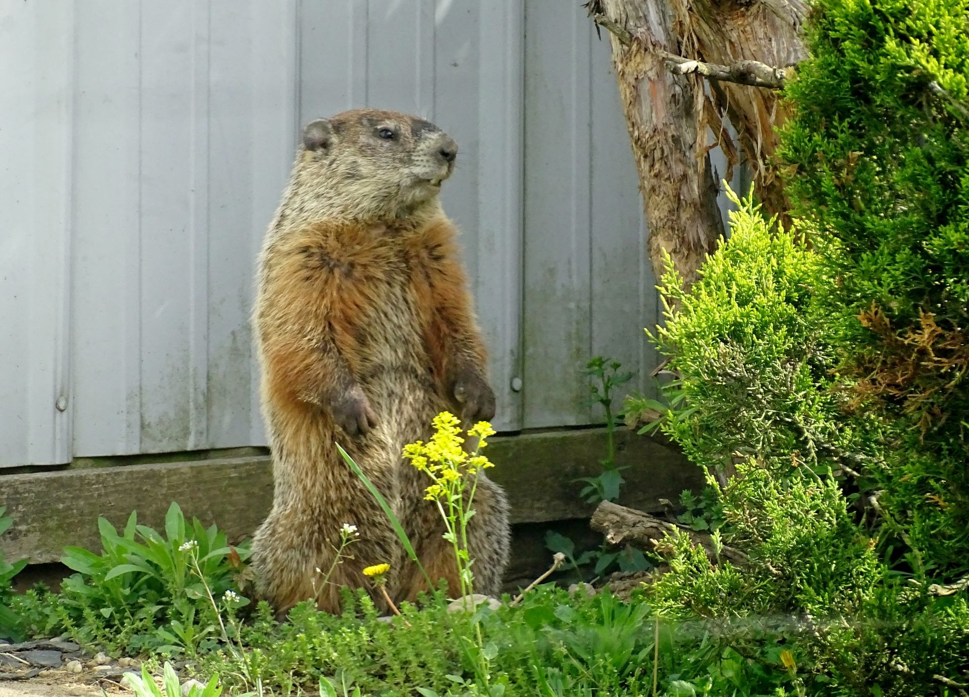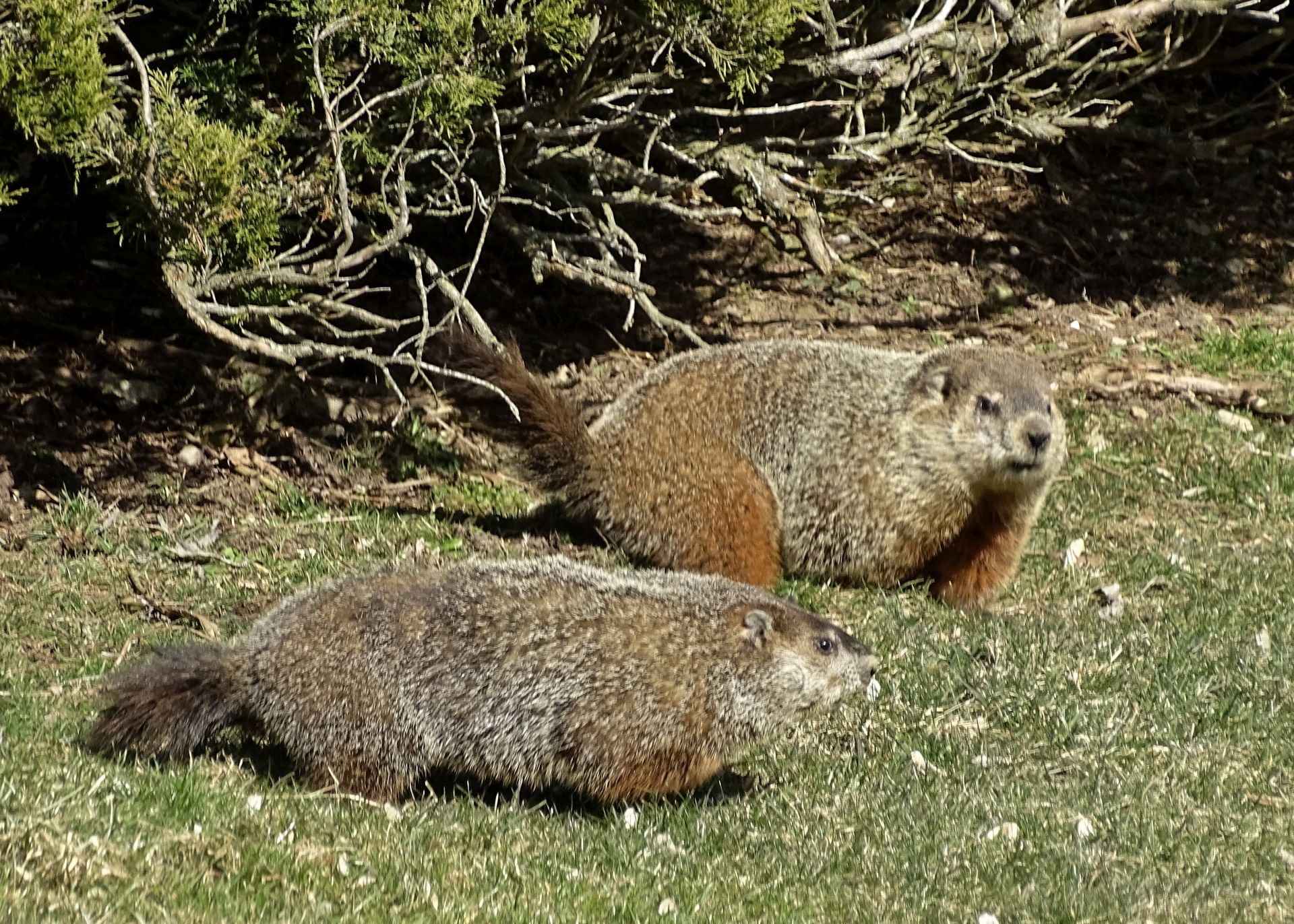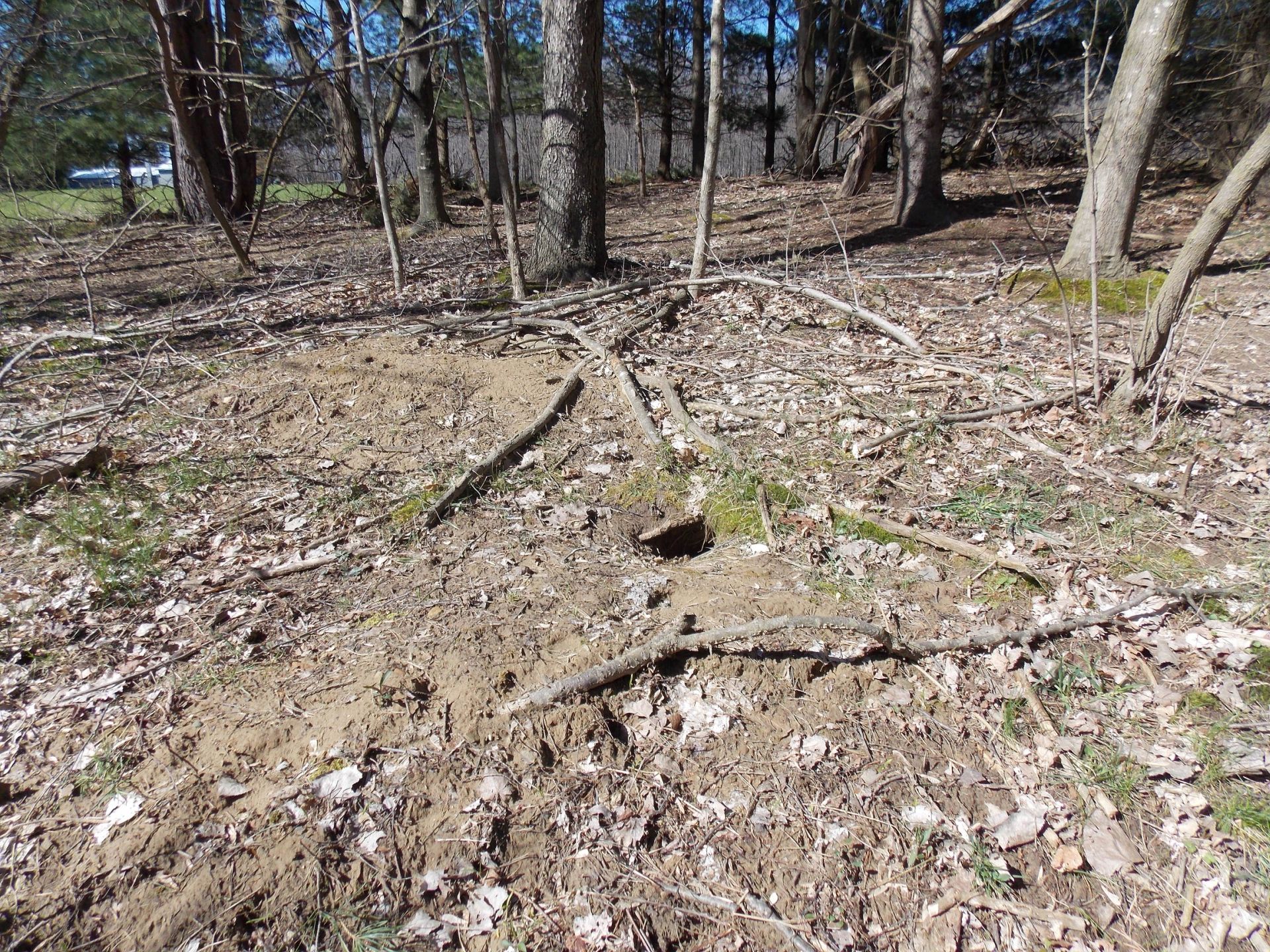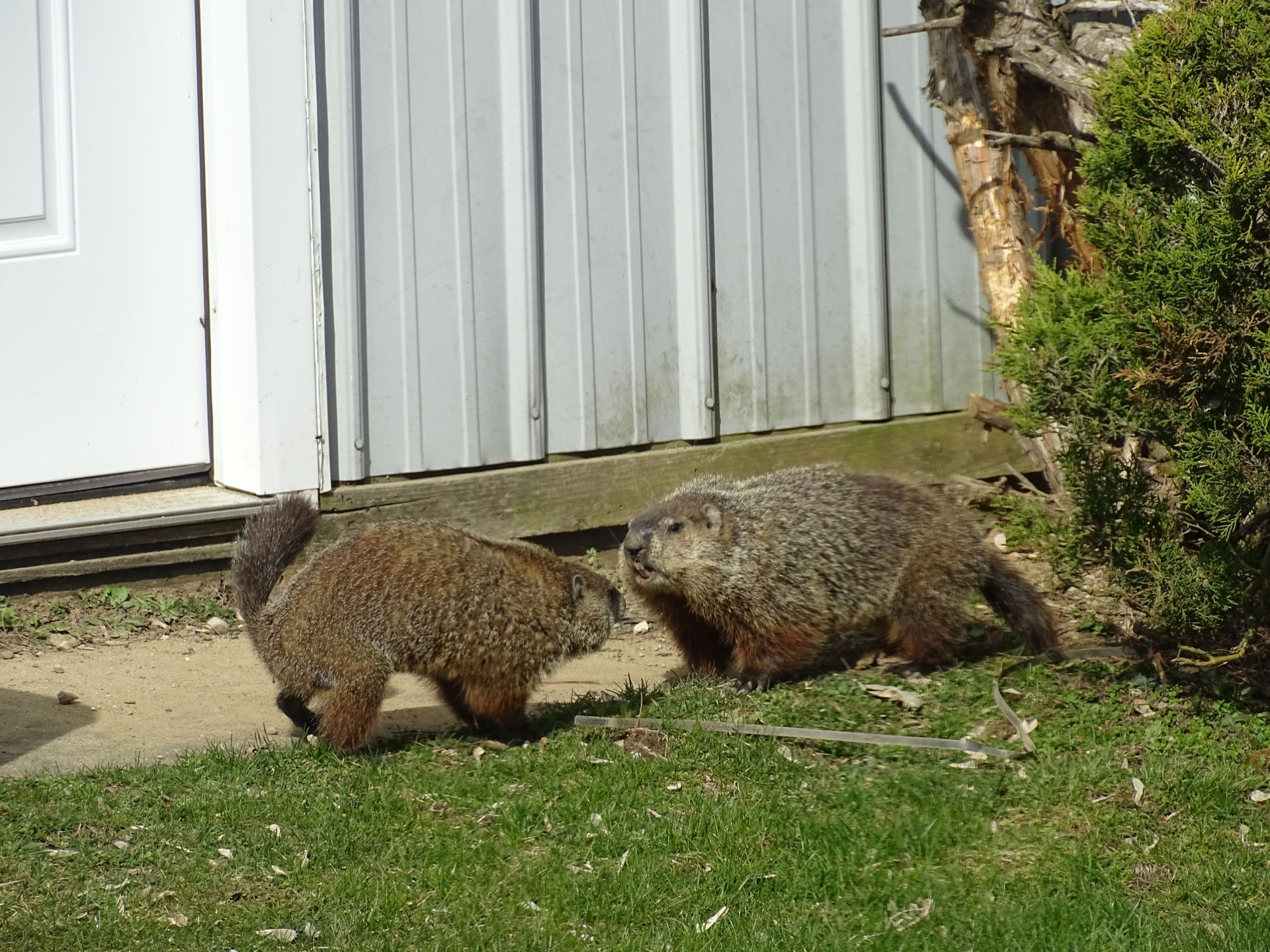 Winnie later dug a new burrow near the deck. As she already had another burrow nearby, this opening was filled in. A newer burrow north of our driveway has been observed being used by Milo, Winnie, and Rusty. This location does not create conflict with us, though it does present observation challenges.