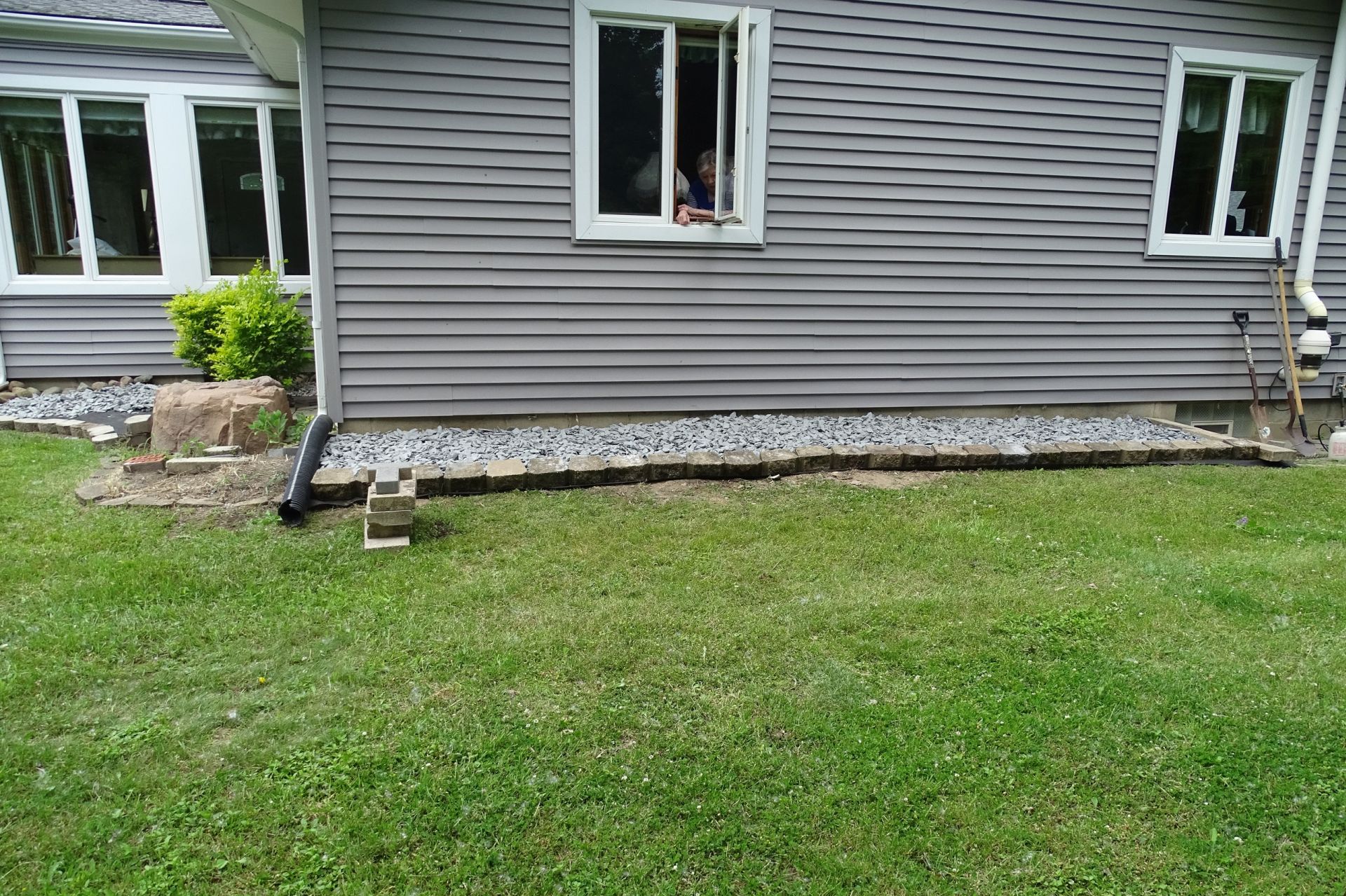 After sightings of Milo ceased, we resumed fill-in work, which involved substantial effort. Along the side of our house, we removed bushes, laid chicken wire and heavy steel mesh, installed a weed barrier, and covered the area with landscape stones. Steel mesh was also placed beneath the faux rock. In addition, damage to the siding’s J-channel caused by chewing required repair.