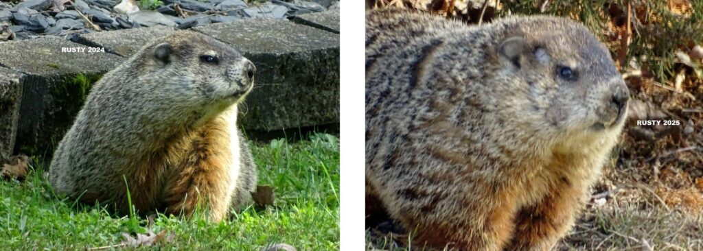 The deteriorating railing in our front yard was replaced in September. Many chucks have used the railing as an observation point, and we wanted them to continue to have that option. A new photo review determined that Rusty was the chuck seen on September 2nd. Winnie was last seen at the end of September.
