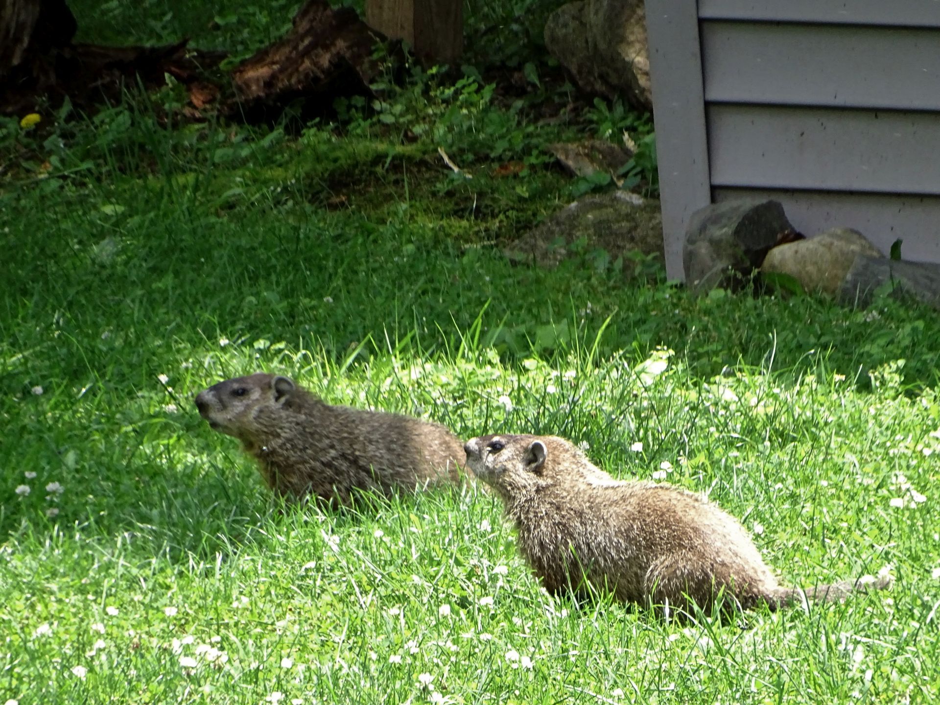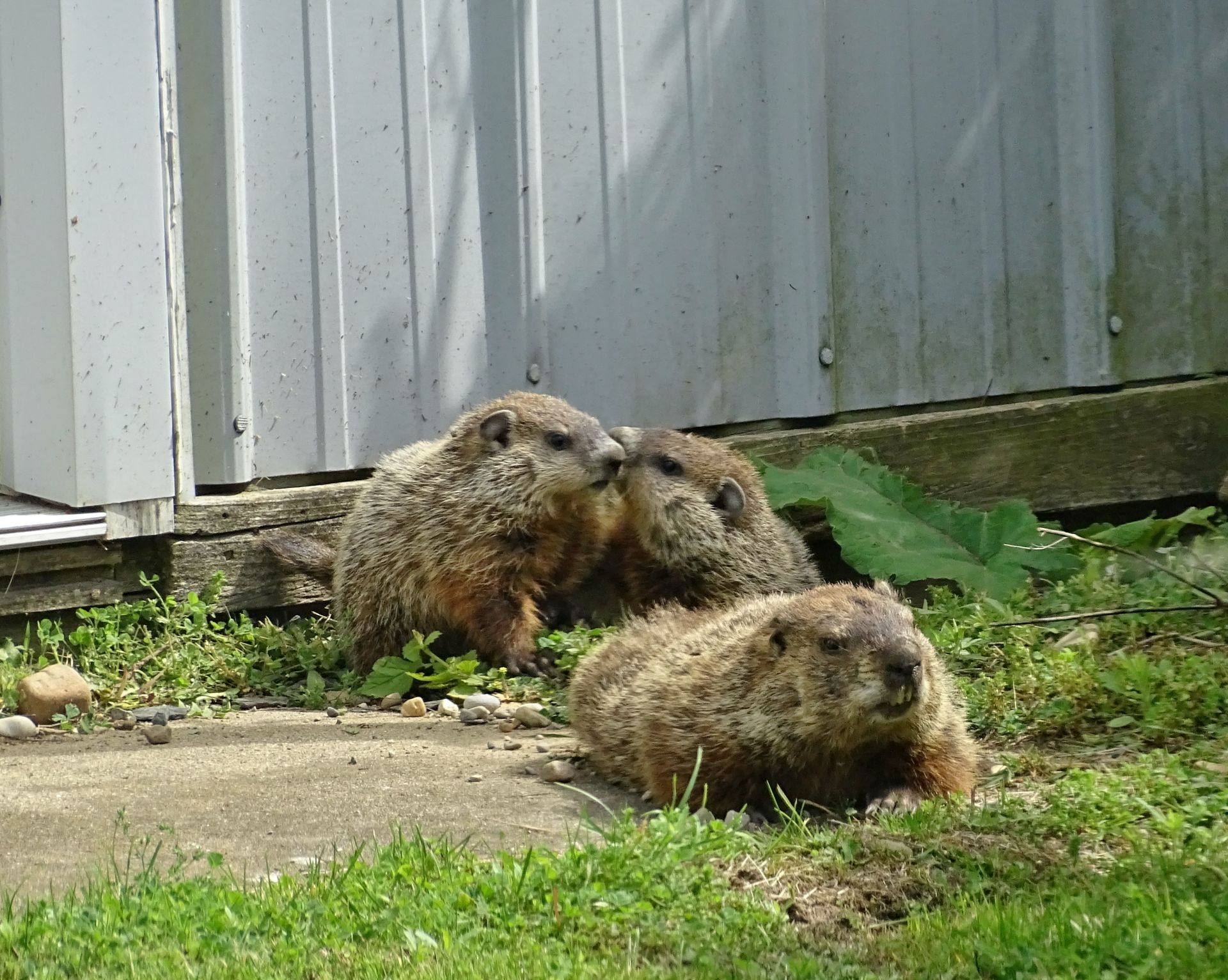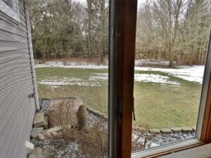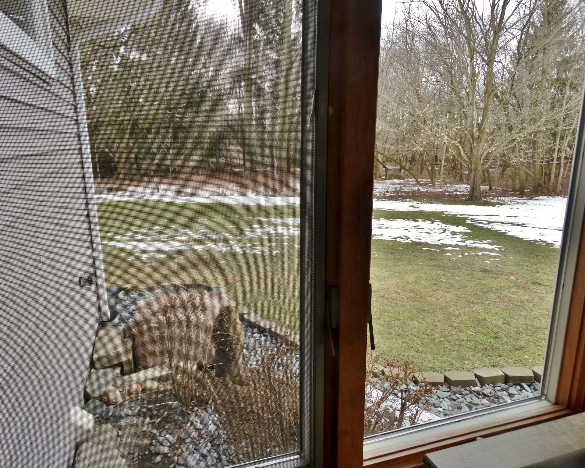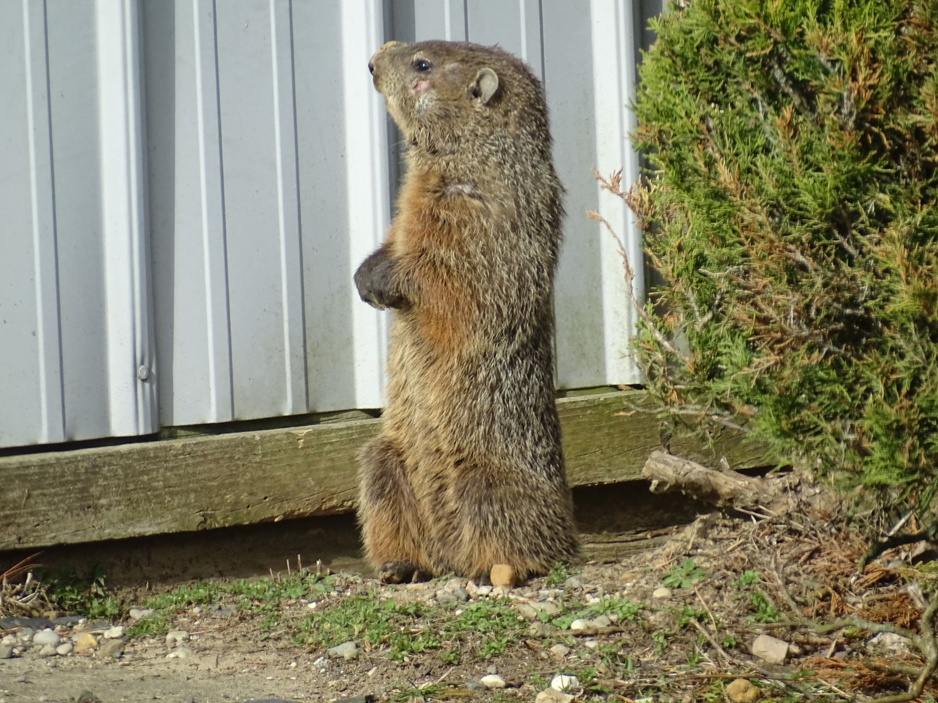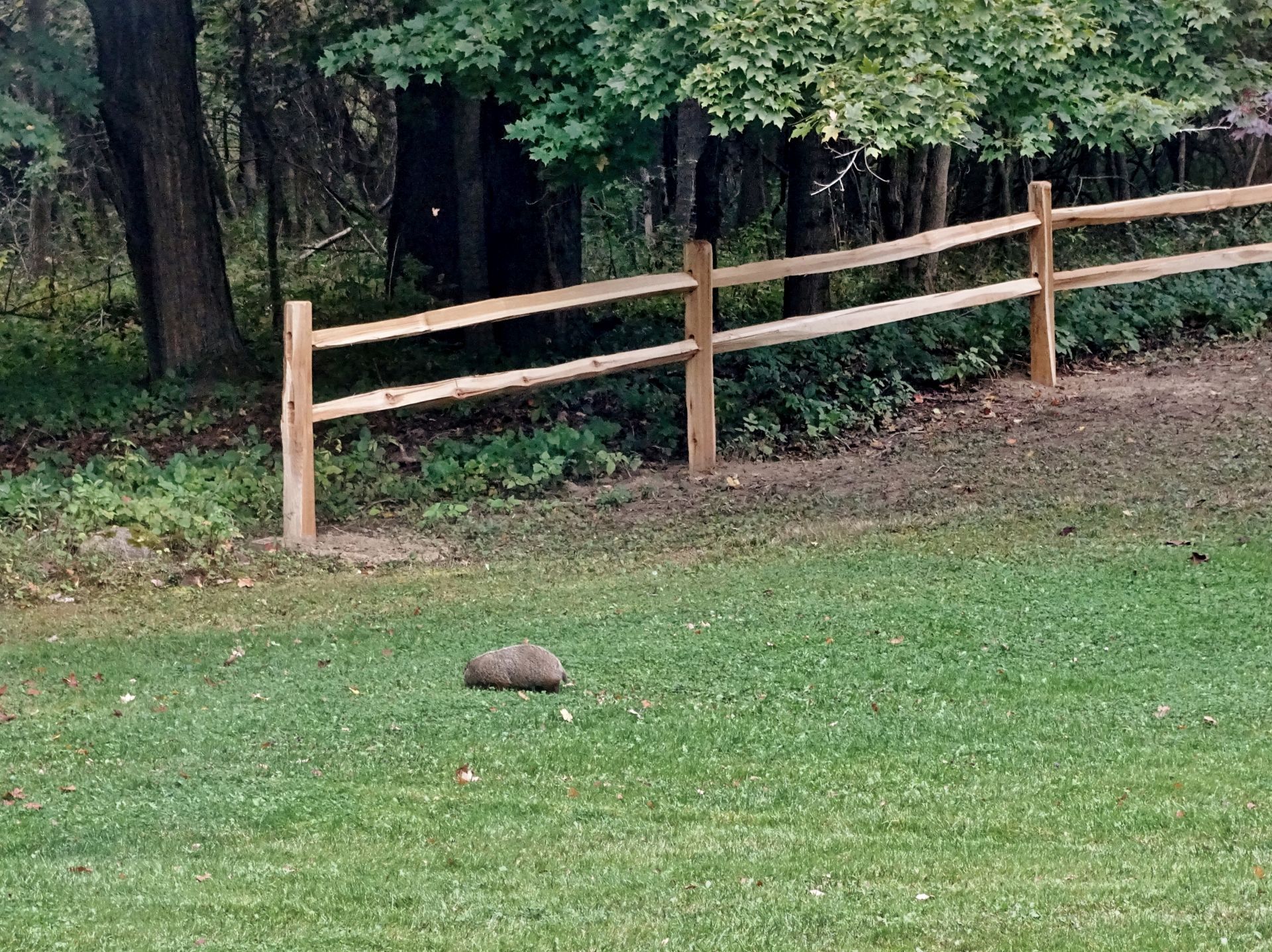 Human activity on the property was deliberately adjusted to minimize impact on the groundhogs, particularly during the breeding and juvenile development period. Tree cutting was postponed until young groundhogs were older, and existing structures used by the animals—such as the front-yard railing—were replaced with care to preserve their utility as observation points. These decisions are part of an ongoing effort to coexist with, rather than manage, the wildlife presence here.