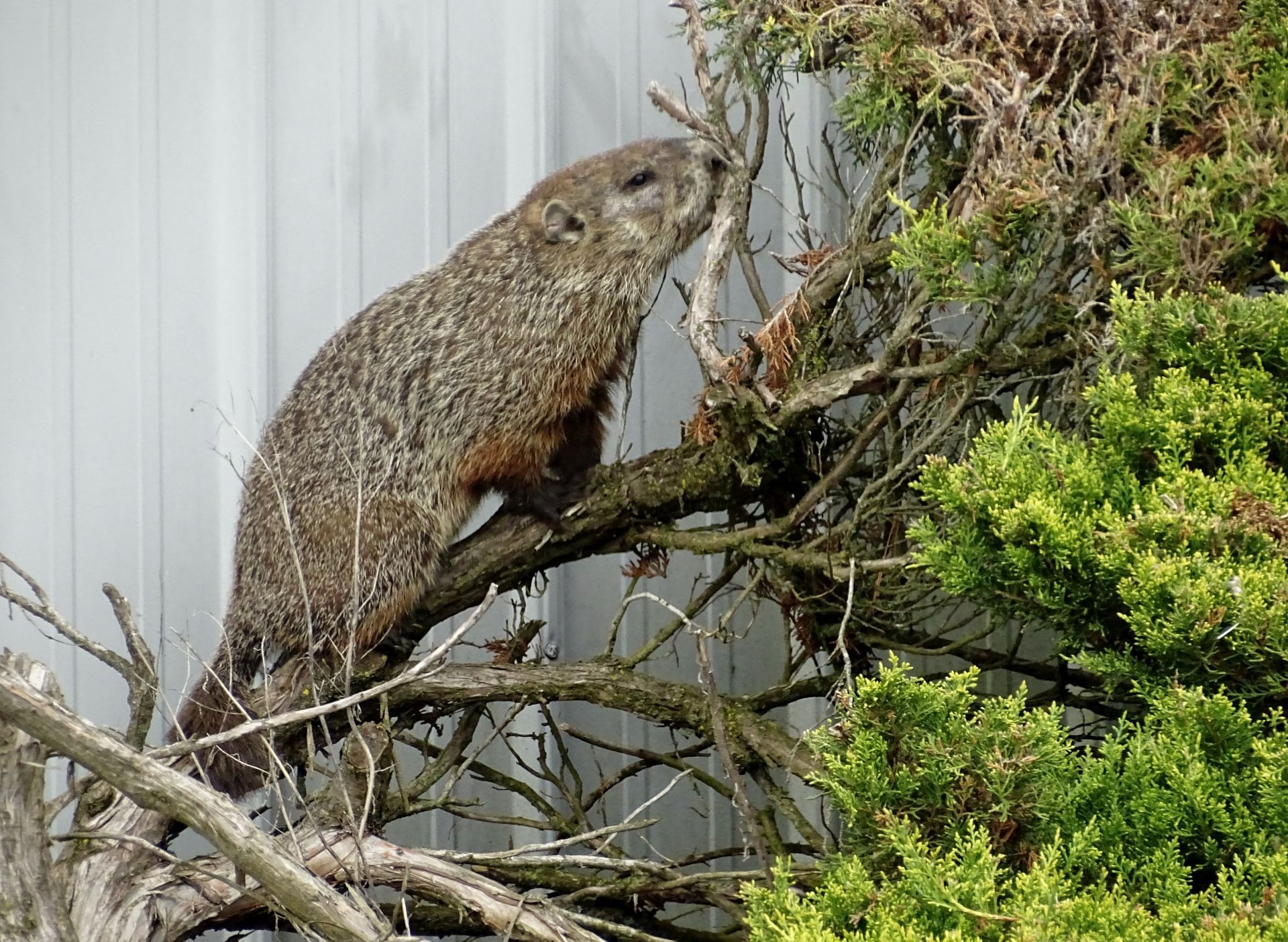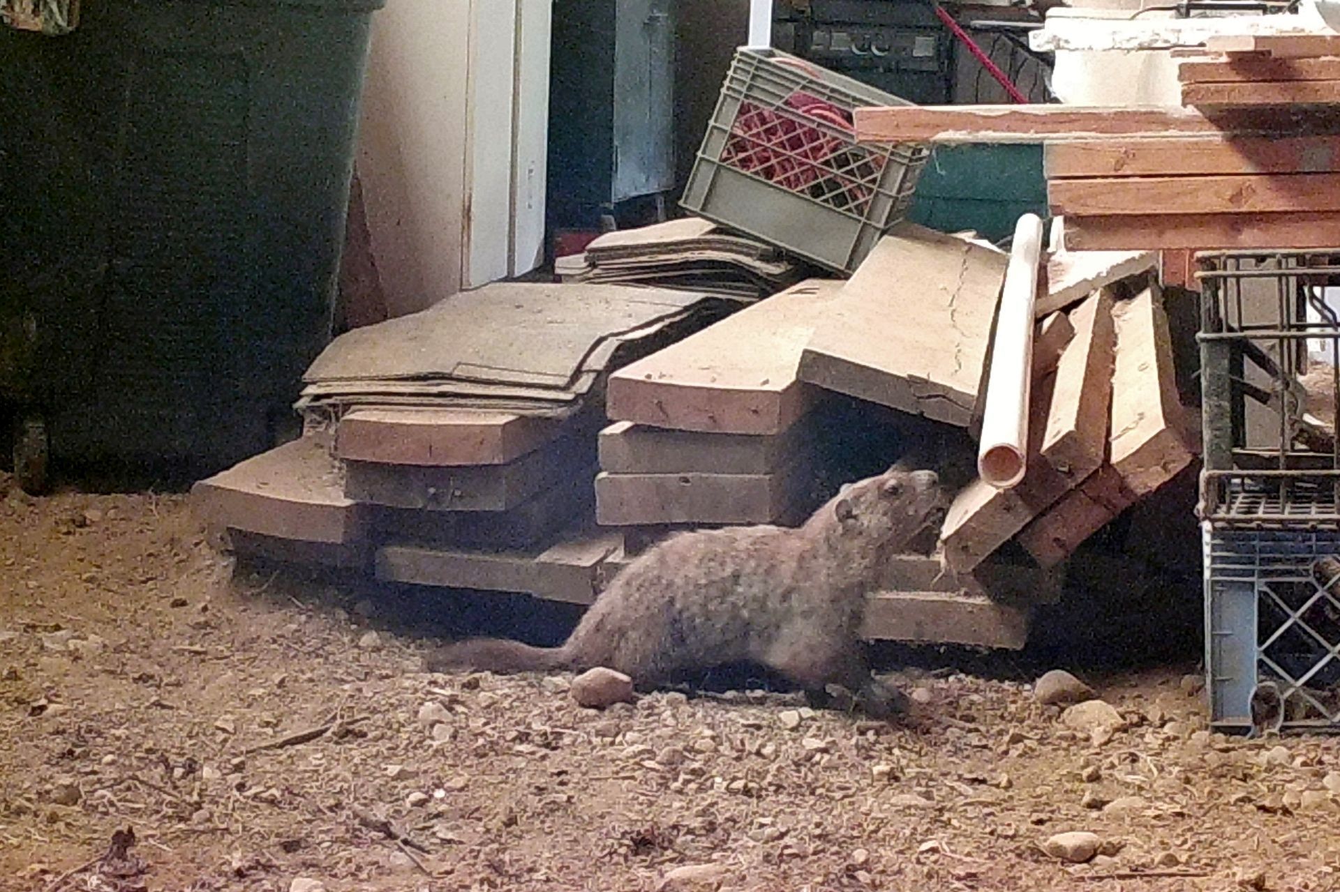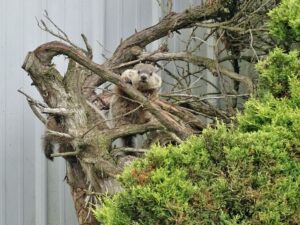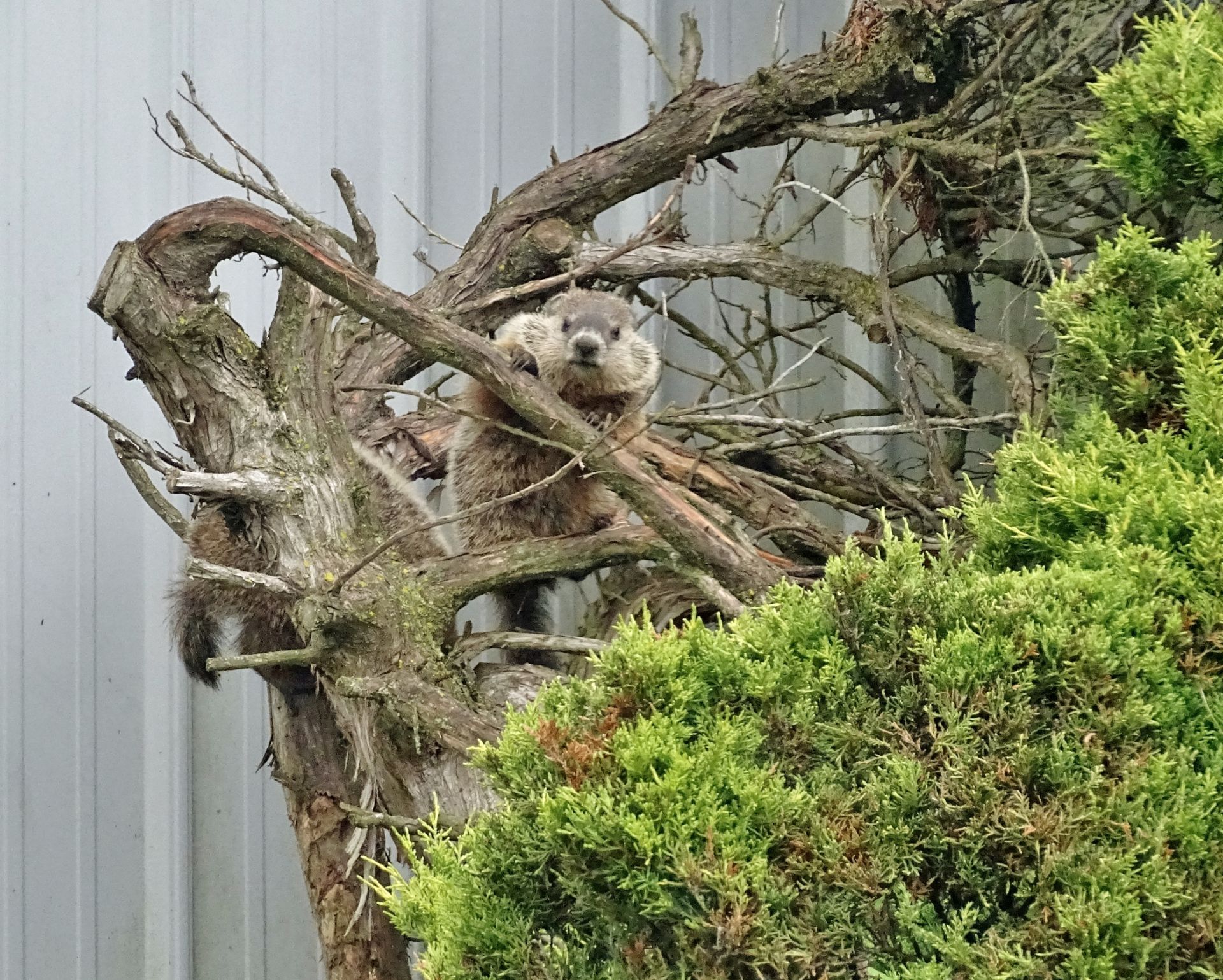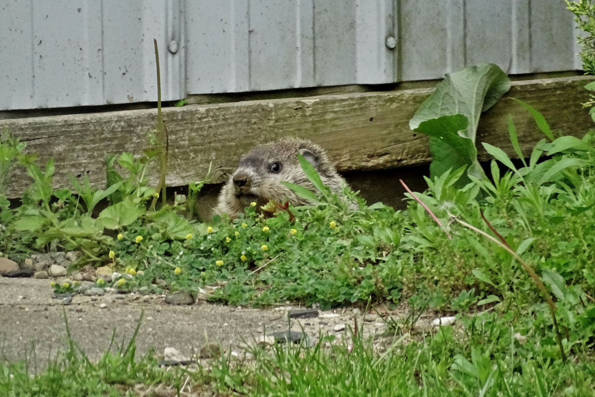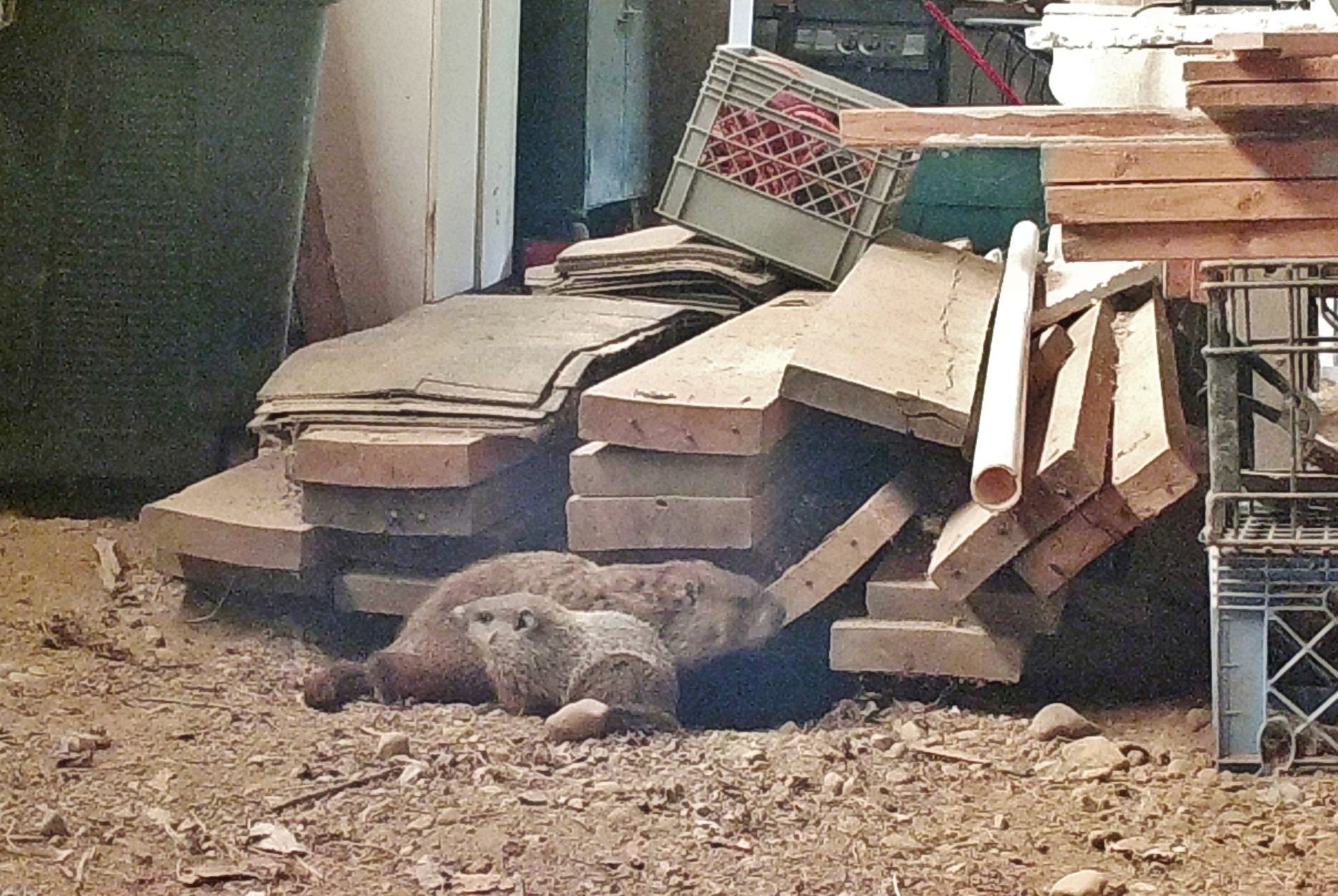 Human activity on the property was deliberately adjusted to minimize impact on the groundhogs, particularly during the breeding and juvenile development period. Tree cutting was postponed until young groundhogs were older, and existing structures used by the animals—such as the front-yard railing—were replaced with care to preserve their utility as observation points. These decisions are part of an ongoing effort to coexist with, rather than manage, the wildlife presence here.