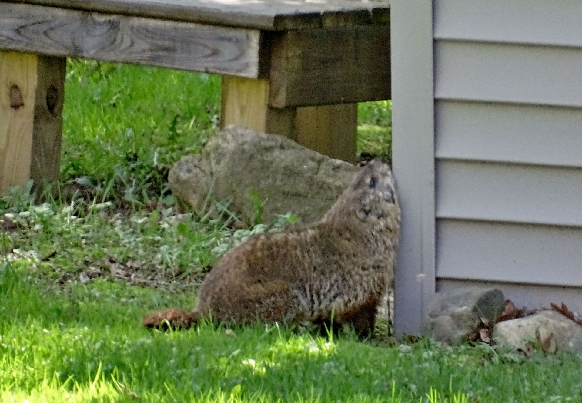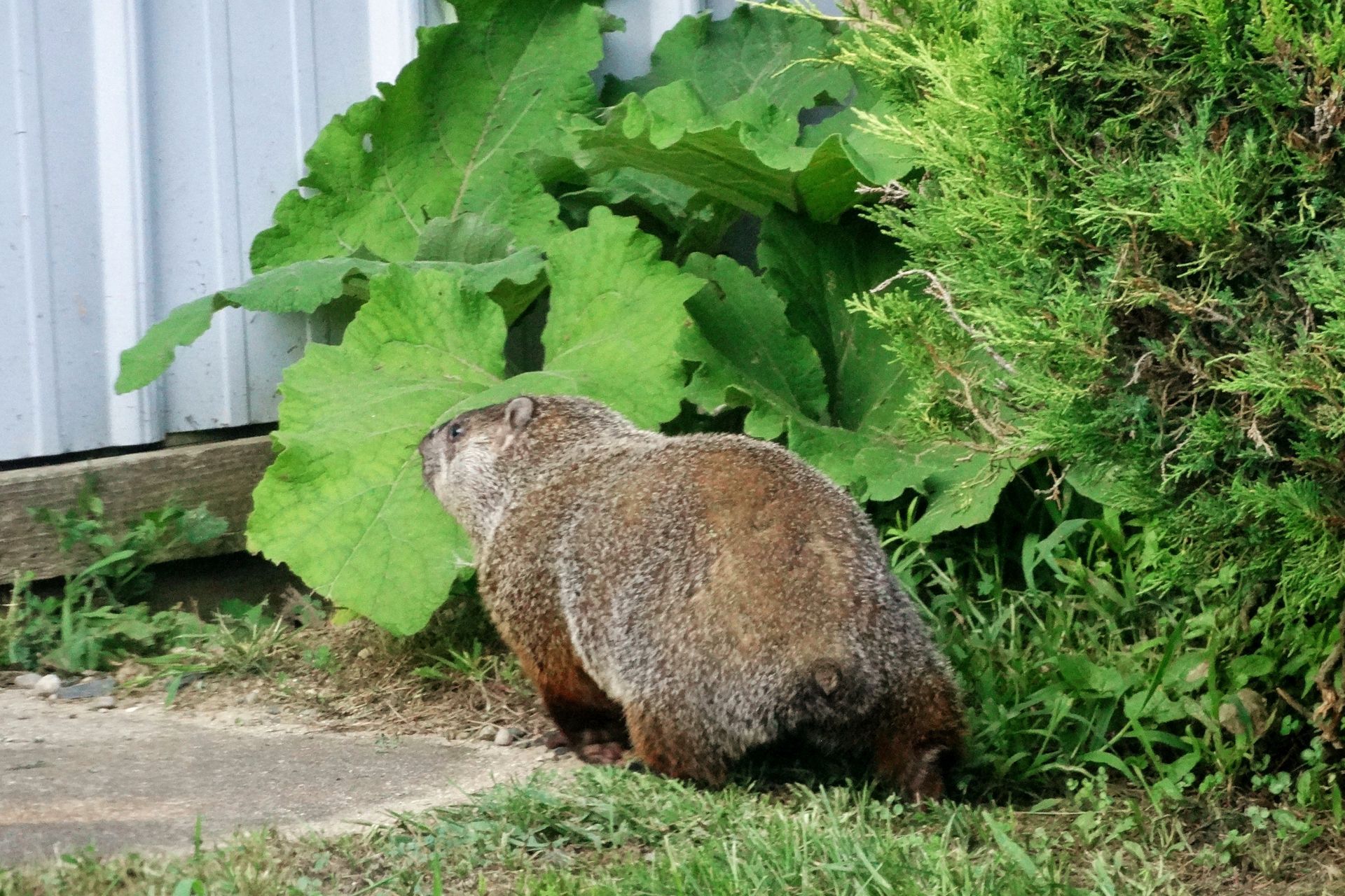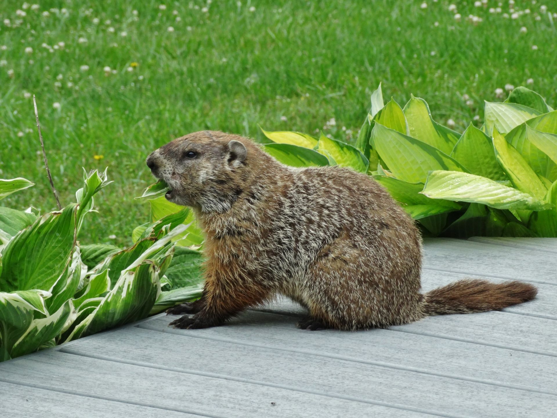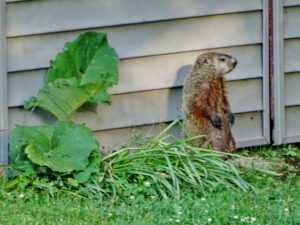 Threo was seen on our deck on June 20th eating the leaves of our hosta plant. We had not previously documented hosta leaves as a food source, so our website page, Woodchuck Foods, has been updated to include them.
