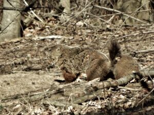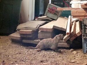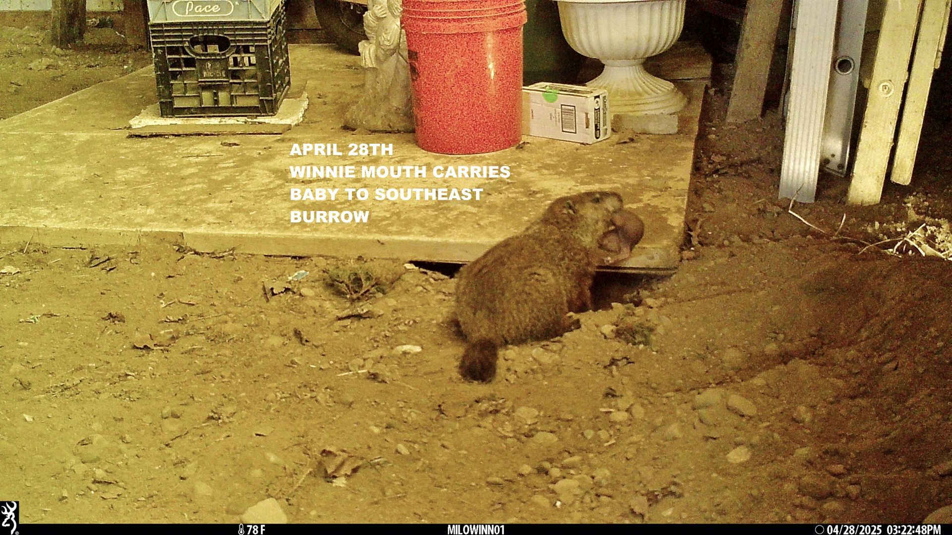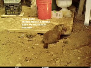 On March 17th, a third groundhog—a male—was seen at the north-of-driveway burrow. We referred to him as Chuck #3 before officially naming him Threo. Both he and Rusty made visits to several burrows in the area, including the north-of-driveway burrow. On April 28th there was a visit from an unknown chuck. On that same date, the remote camera in our barn captured Winnie mouth-carrying her tiny baby to the southeast barn burrow.