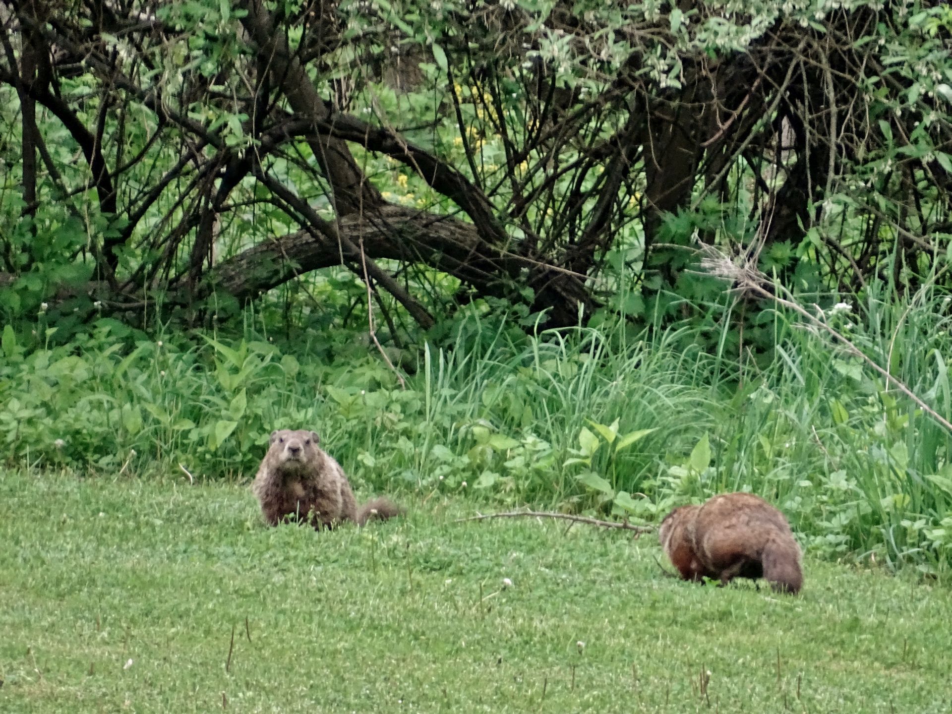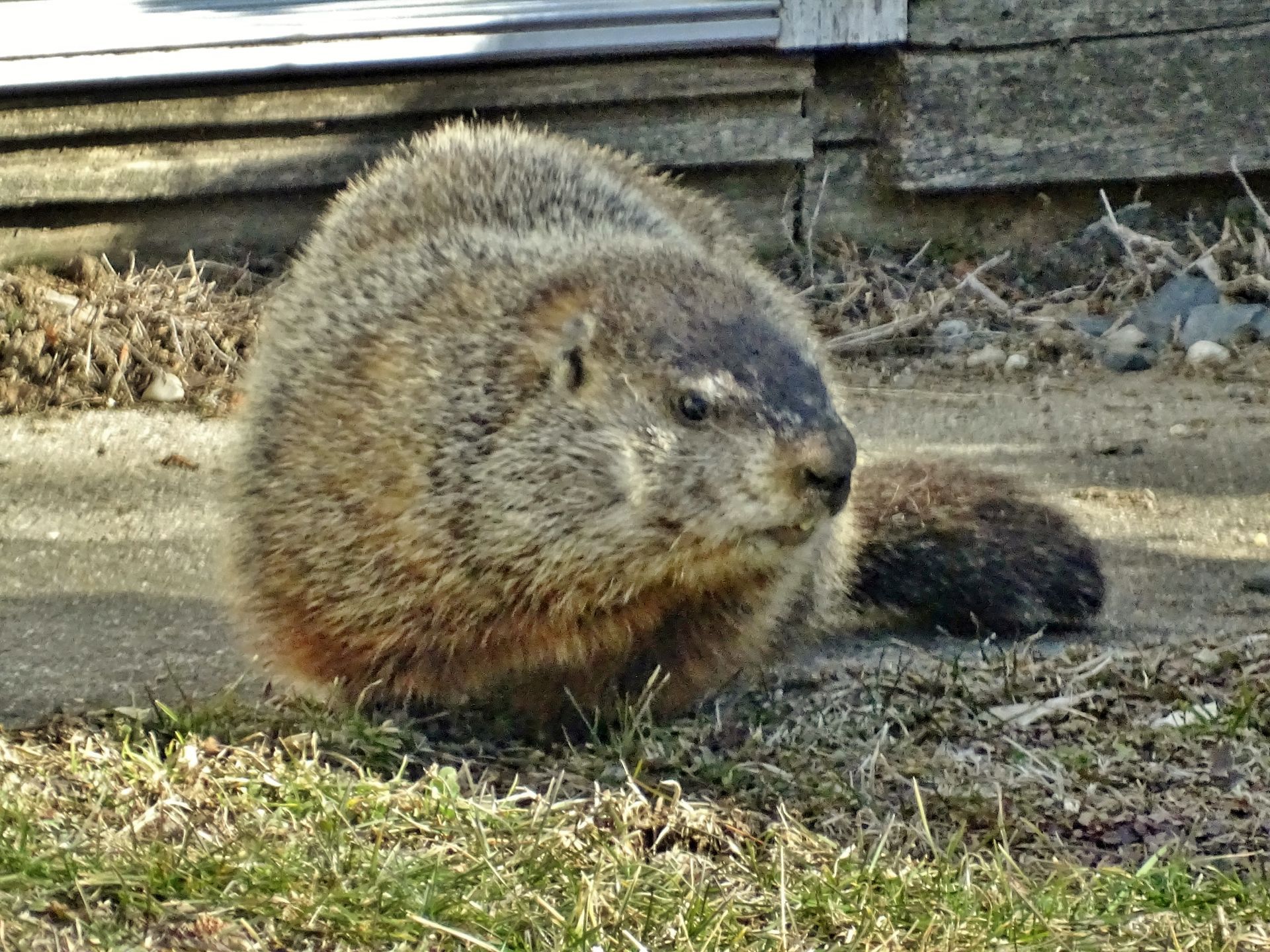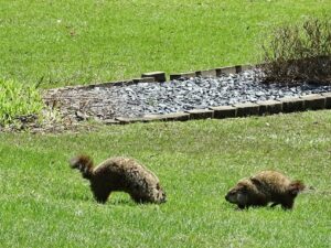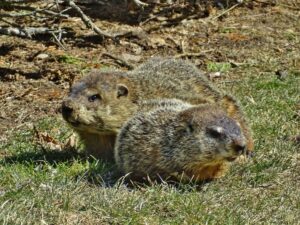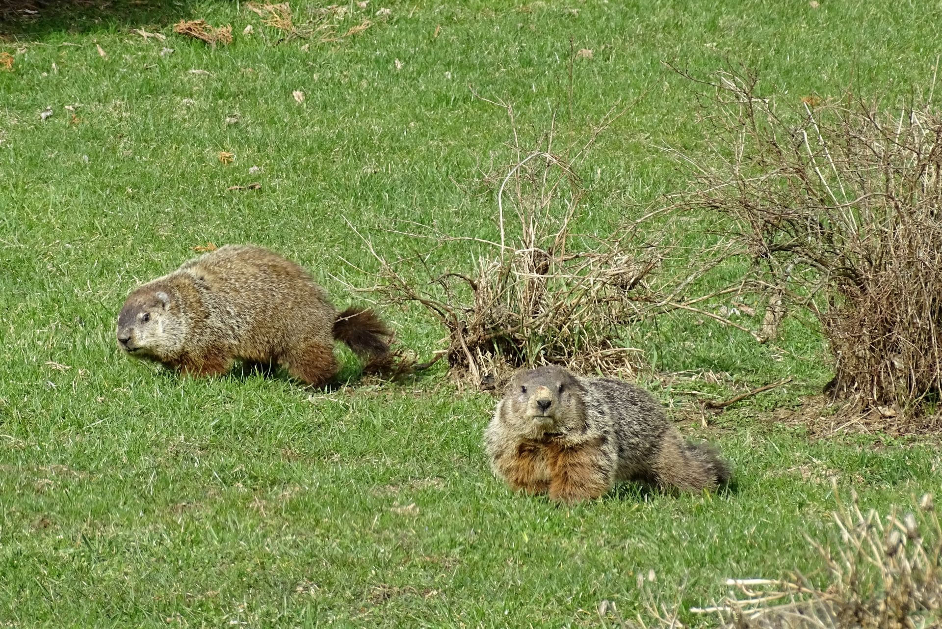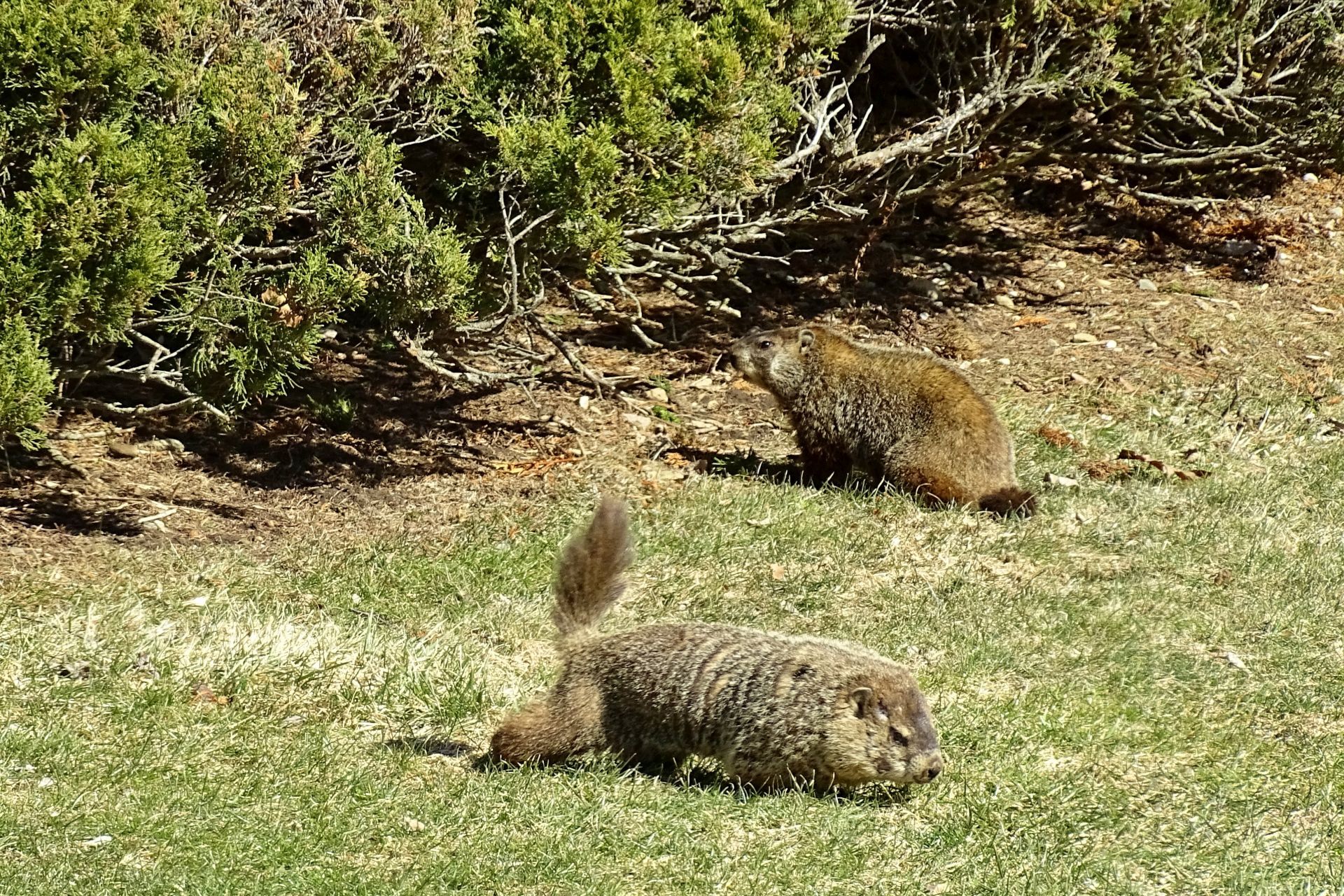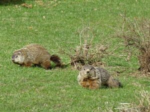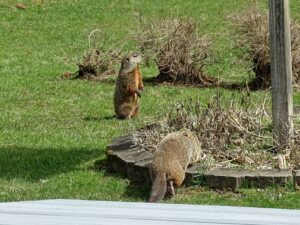 On March 9th, a second chuck—a female—was seen. She and Rusty were observed around the barn before both moved off toward the north-of-driveway burrow. While watching the two of them the following day, the female was identified as Winnie by her deformed ear.