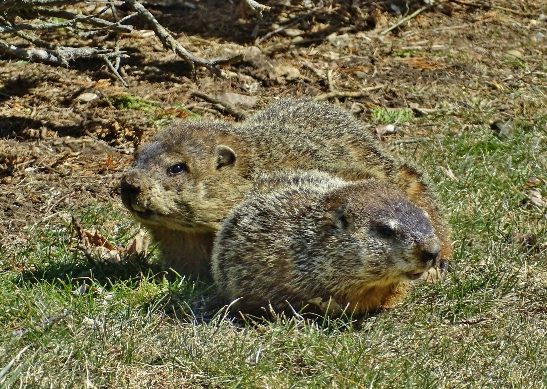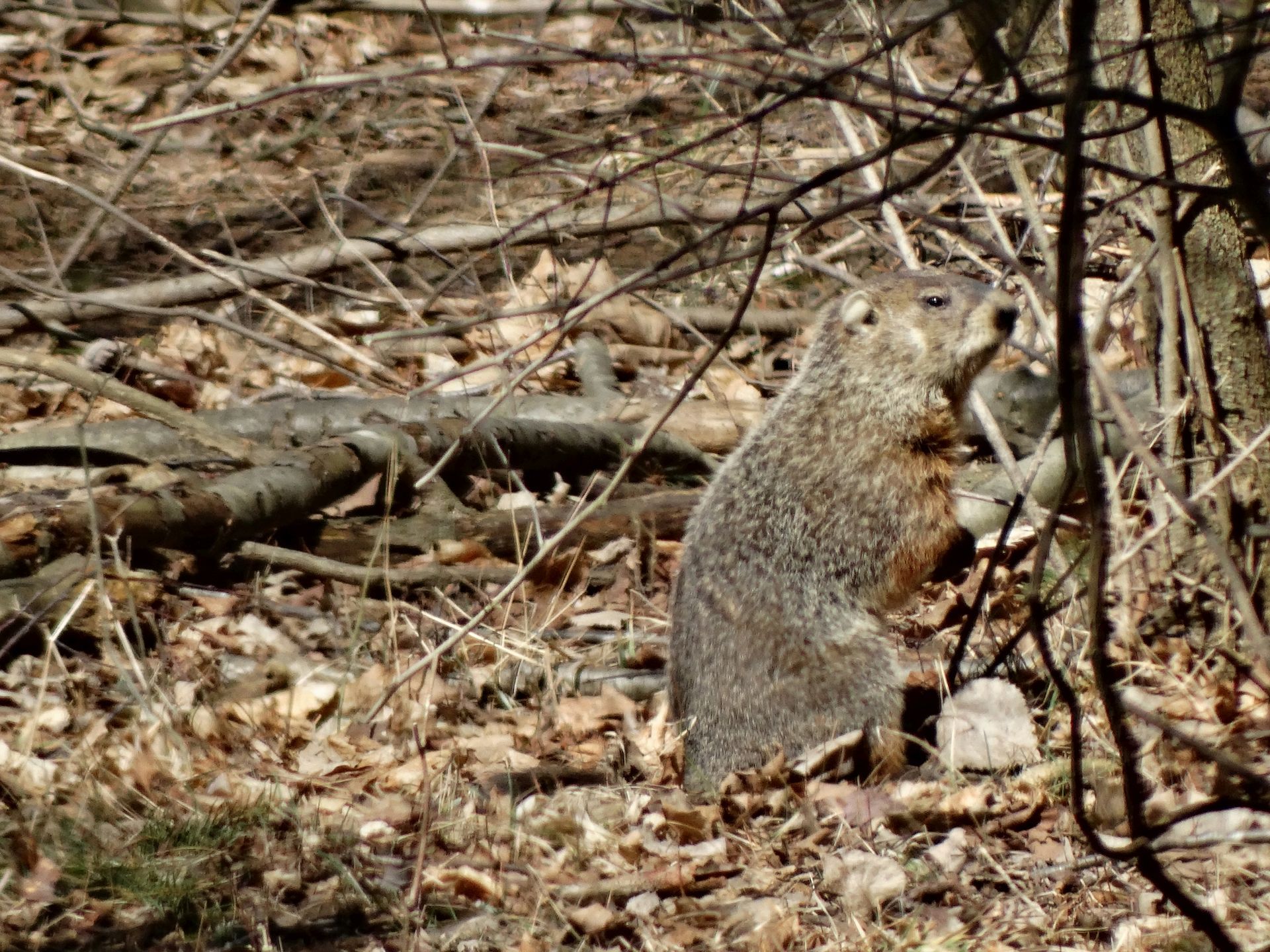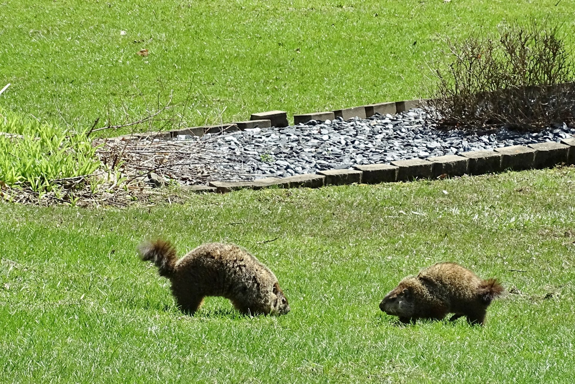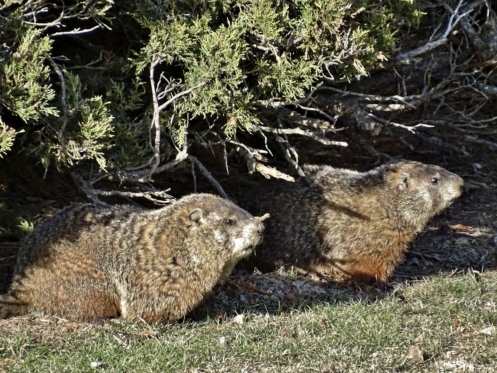 On March 9th, a second chuck—a female—was seen. She and Rusty were observed around the barn before both moved off toward the north-of-driveway burrow. While watching the two of them the following day, the female was identified as Winnie by her deformed ear.
