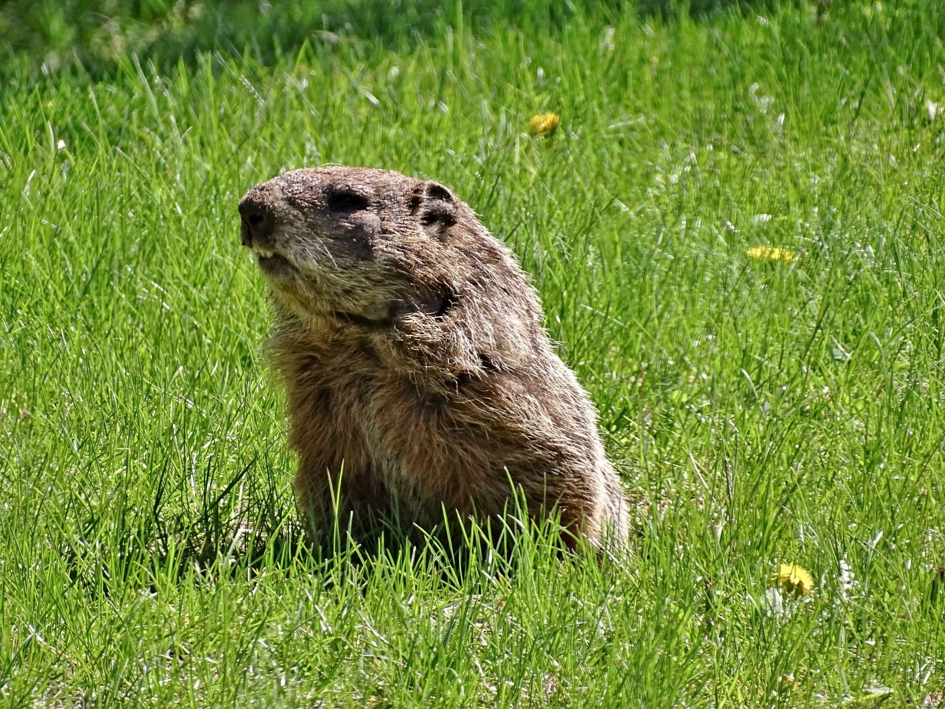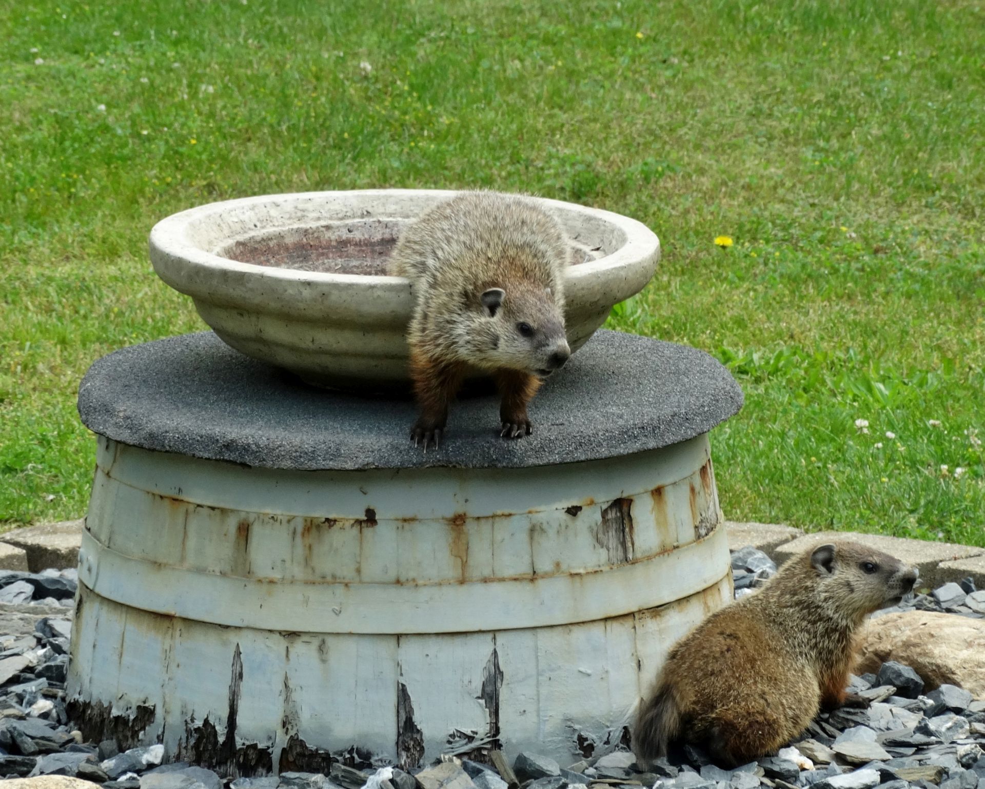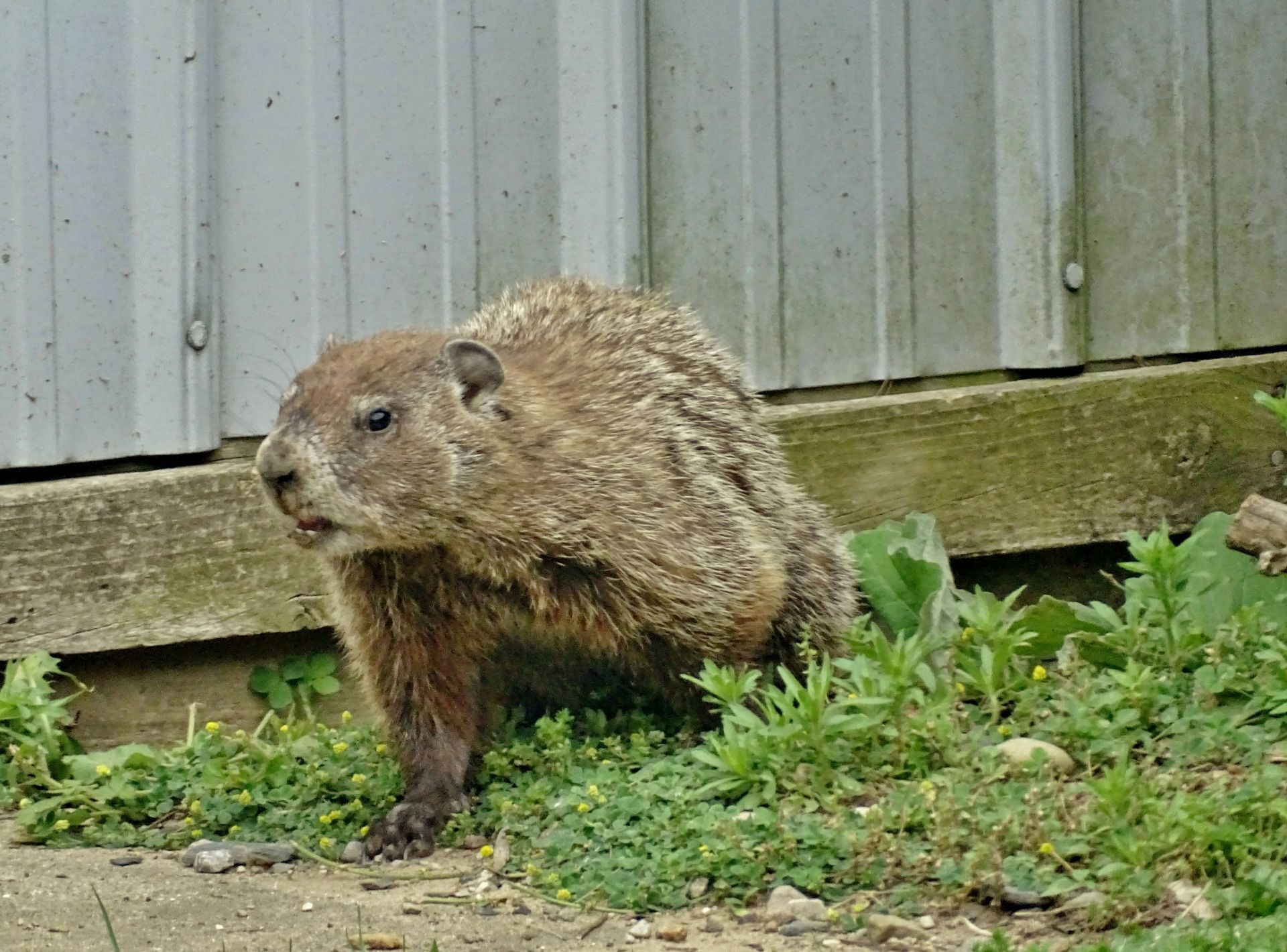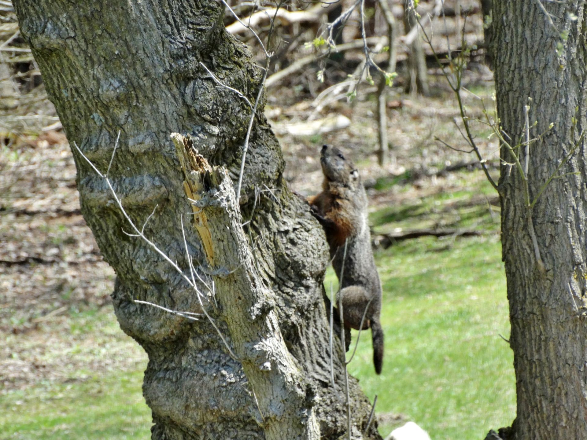 On March 9th, a second chuck—a female—was seen. She and Rusty were observed around the barn before both moved off toward the north-of-driveway burrow. While watching the two of them the following day, the female was identified as Winnie by her deformed ear.
