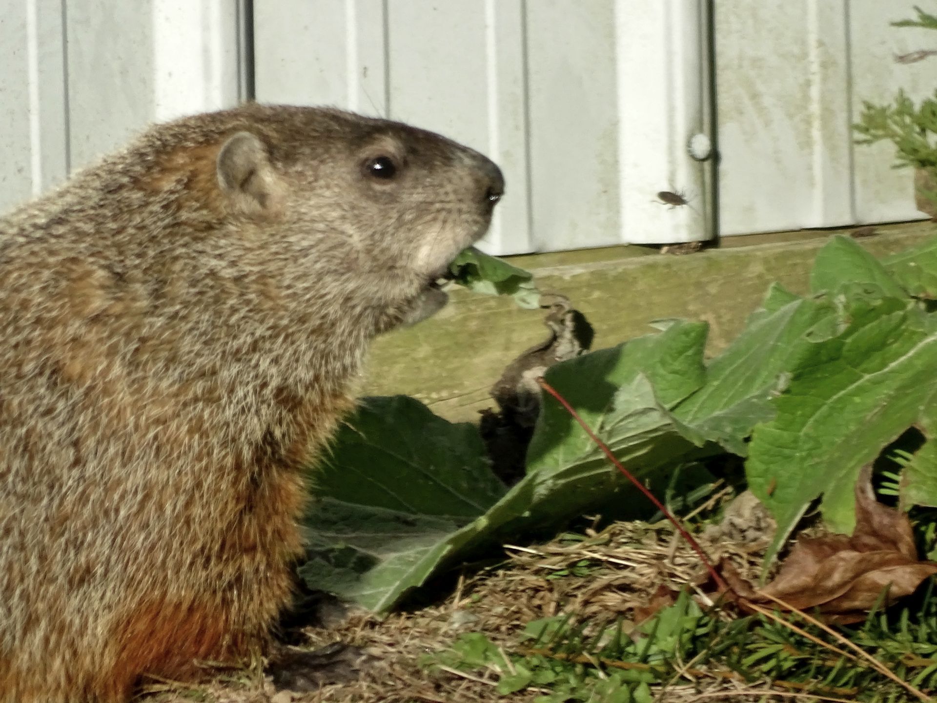 On October 17th, we were delighted to see a new groundhog visitor. We determined that the same chuck visited again on October 27th and October 28th, and we named this groundhog Charlie. Visits continued into November. Charlie was documented eating a non-native plant, Lesser Burdock (Arctium minus). This plant has been added to the Woodchuck Foods page.