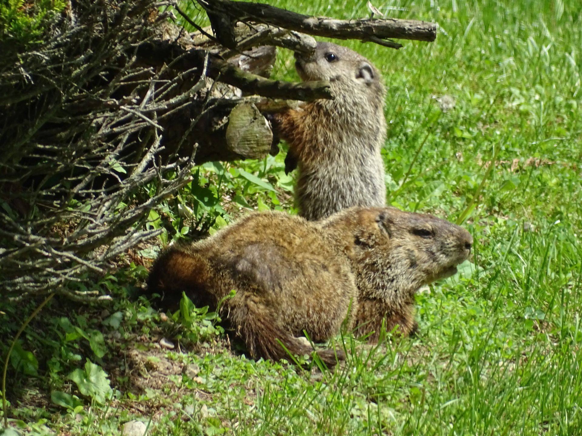 During the month of May, we did some chuck hole fill-in work, though not extensively. There was a visit by another unknown chuck on May 23rd. Also on May 23rd, we watched babies emerge from the southeast barn burrow on our baby monitor. There were three offspring. Soon after, they made their way outside, exploring the vegetation and climbing the bushes. We named the most advanced of the three Cody.
