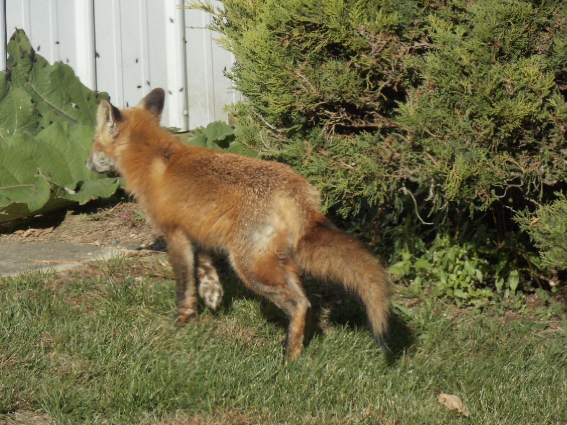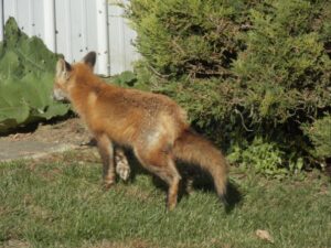 Two of the siblings appeared closely attached to each other and were most often seen together. After not seeing Winnie for about three weeks, she reappeared on July 31st missing most of her tail. Review of remote camera photos later showed that the loss of her tail occurred sometime on July 5th or July 6th. As was the case last year, red fox continued their visits to our property.